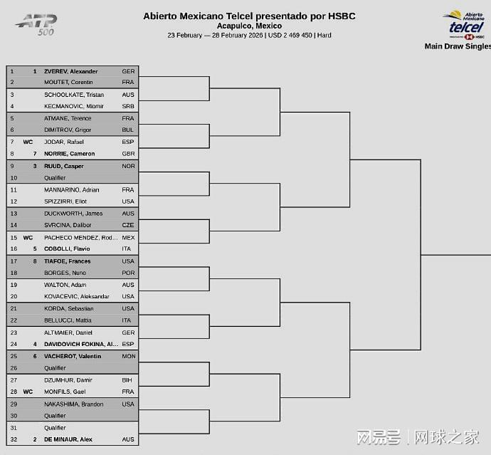 我们再来关注下周赛事。北京时间昨晚,下周的巡回赛相继公布了正赛签表。ATP500阿卡普尔科站由德国名将小兹维列夫和澳洲小野兔德米纳尔领衔,鲁德、迪米特洛夫、瓦舍罗等球员将出战。