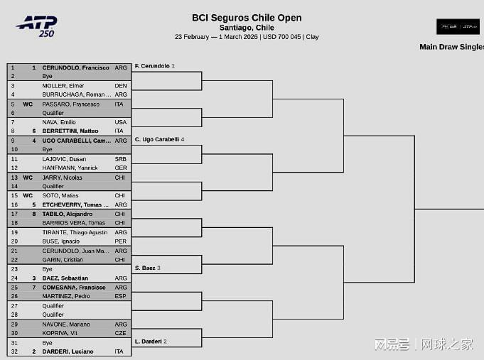 ATP250圣地亚哥站的前两号种子是阿根廷人F-塞伦德罗和意大利人达尔德里,贝雷蒂尼、埃切维里等球员将连续两周参赛。